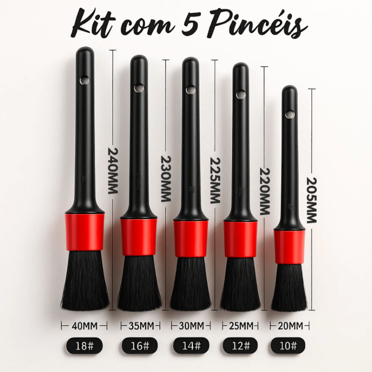 Com 5 tamanhos diferentes, os pincéis alcançam áreas estreitas e de difícil acesso, garantindo um acabamento impecável tanto na parte interna quanto externa do veículo.